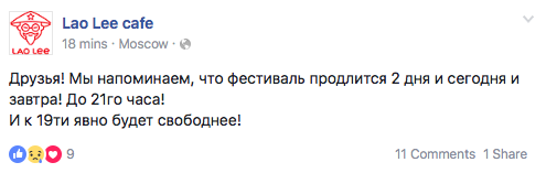 Вероятно, организаторы не рассчитывали на такое количество пришедших в первые часы: только в фейсбуке 3400 тысячи людей указали, что собираются пойти, а 7700 отметили, что заинтересованы в мероприятии. На жалобы организаторы фестиваля, владельцы кафе Lao Lee, напомнили, что фестиваль продлится два дня — сегодня и завтра до 21.00, — и к 19.00 очереди должны уменьшиться.